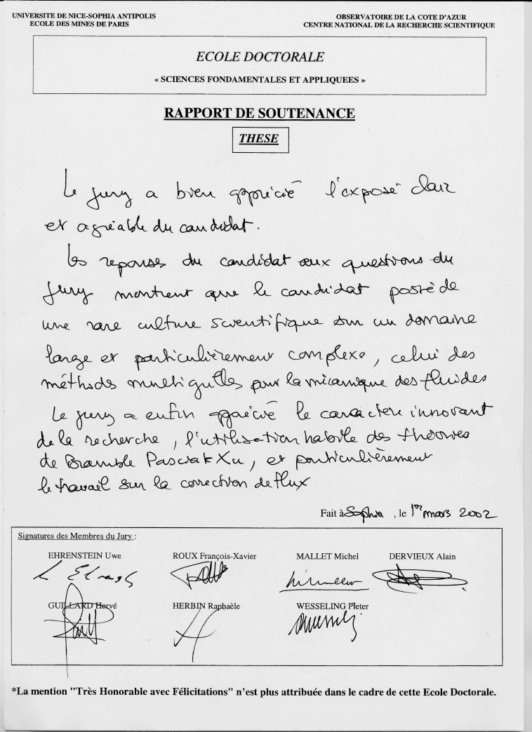 Les réponses du candidat aux question du jury montrent que le candidat possède une rare culture scientifique sur un domaine large et particulièrement complexe, celui des méthodes multigrilles pour la mécanique des fluides. Le jury a enfin apprécié le caractère innovant de la recherche, l'utilisation habile des théorèmes de Bramble, Pasciak, Xu, et particulièrement le travail sur la correction de flux. |