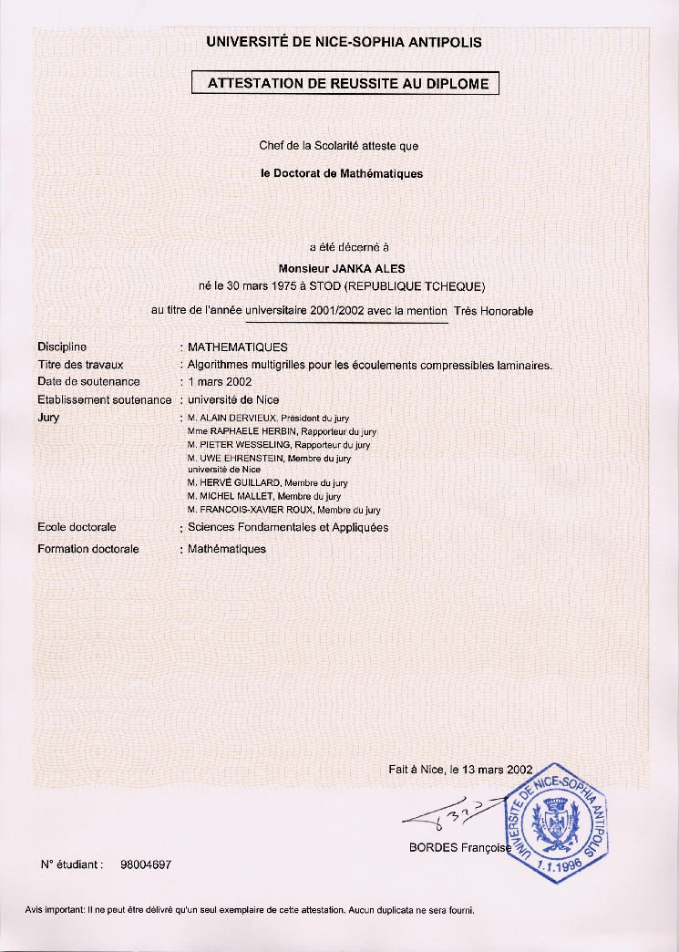 Kandidátovy odpovedi na otázky komise ukazují, ze má vyjímecnou vedeckou kulturu v siroké a obzvláste slozité doméne, v multigridních metodách pro mechaniku tekutin. Komise konecne ocenila inovující charakter jeho výzkumu, zrucné pouzití teorému Brambla, Pasciaka a Xu, a obzvláste jeho práci o flux-correction (korekce toku). |